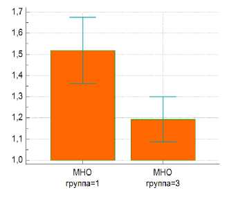 Зависимость МНО между вирусными и токсическими (рис. 8). При сравнении токсических и вирусных циррозов печени достоверно значимо выраженное повышение показателя МНО при токсической этиологии ЦП, что значимо подтверждает повышение гипокоагуляции (кровотечения) при токсических циррозах печени, чем при вирусных.