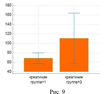 При сравнении токсических и вирусных циррозов печени достоверно значимо выраженное повышение показателя креатинина при вирусной этиологии ЦП, что значимо подтверждает снижение почечной функции при вирусных циррозах печени, чем при токсических (рис. 9).