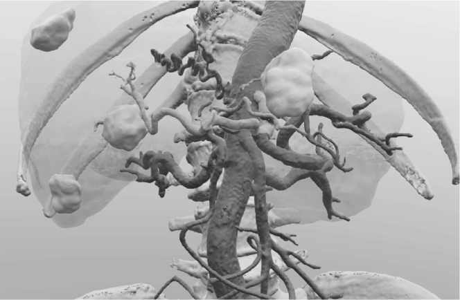 Совершенствование КТ с 3D-моделированием сделало её ключевым методом предоперационной визуализации, определяющим резектабельность и тактику (рис. 3). ТАХЭ с гепосферами и доксорубицином выполнена 34 пациентам, что позволило уменьшить опухоли и провести абляцию. Послеоперационные осложнения были минимальными (субфебрилитет, повышение трансаминаз в течение 3 дней). Годовая выживаемость в группе из 12 пациентов составила 84 % (10 больных). Средний койко-день – 4 суток.