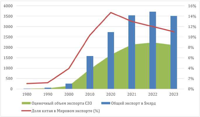 Рисунок 2 — Сопостав л ение д ин амики экспорта СЭЗ и общег о э кспорта эко н омики Китая