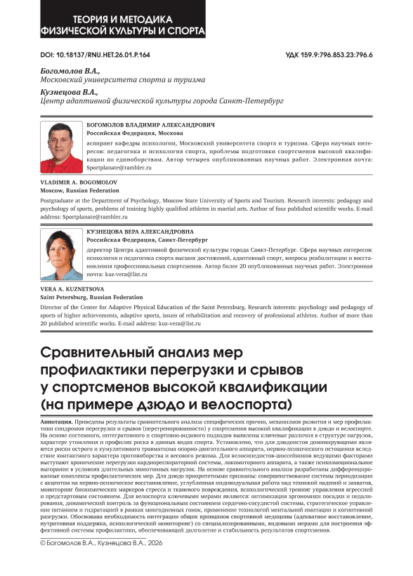 Приведены результаты сравнительного анализа специфических причин, механизмов развития и мер профилактики синдромов перегрузки и срывов (перетренированности) у спортсменов высокой квалификации в дзюдо и велоспорте. На основе системного, интегративного и спортивно-видового подходов выявлены ключевые различия в структуре нагрузок, характере утомления и профилях риска в данных видах спорта. Установлено, что для дзюдоистов доминирующими являются риски острого и кумулятивного травматизма опорно-двигательного аппарата, нервно-психического истощения вследствие контактного характера противоборства и весового режима. Для велосипедистов-шоссейников ведущими факторами выступают хронические перегрузки кардиореспираторной системы, локомоторного аппарата, а также психоэмоциональное выгорание в условиях длительных монотонных нагрузок. На основе сравнительного анализа разработаны дифференцированные комплексы профилактических мер. Для дзюдо приоритетными признаны: совершенствование системы периодизации с акцентом на нервно-психическое восстановление, углубленная индивидуальная работа над техникой падений и захватов, мониторинг биохимических маркеров стресса и тканевого повреждения, психологический тренинг управления агрессией и предстартовым состоянием. Для велоспорта ключевыми мерами являются: оптимизация эргономики посадки и педалирования, динамический контроль за функциональным состоянием сердечно-сосудистой системы, стратегическое управление питанием и гидратацией в рамках многодневных гонок, применение технологий ментальной имитации и когнитивной разгрузки. Обоснована необходимость интеграции общих принципов спортивной медицины (адекватное восстановление, нутритивная поддержка, психологический мониторинг) со специализированными, видовыми мерами для построения эффективной системы профилактики, обеспечивающей долголетие и стабильность результатов спортсменов.