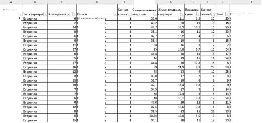 В работе использован открытый набор данных о жилой недвижимости в Москве, размещённый на платформе Kaggle 1 . В выборке представлены сведения о ценовых характеристиках объектов и ряде факторов, потенциально влияющих на формирование их рыночной стоимости.