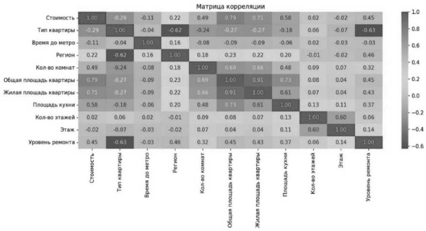 Для дальнейшего анализа взаимосвязей между факторами и целевой переменной были использованы методы корреляционного анализа и факторного анализа. Выбор указанных методов обусловлен необходимостью установления степени влияния отдельных признаков на стоимость объектов.