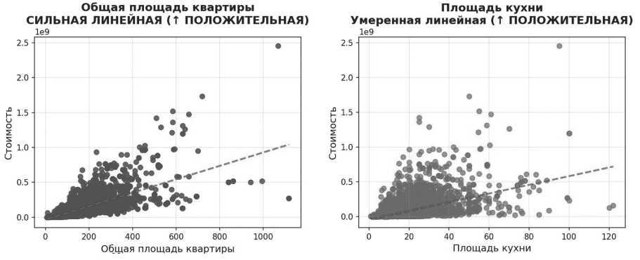 Визуализация парных графиков (см. Рисунок 4) позволяет утверждать, что основная часть признаков демонстрирует линейную направленность влияния на целевую переменную. При этом наблюдаются отдельные случаи нелинейных взаимодействий между факторами. Так, например, значение признака «жилая площадь» оказывает различное влияние на итоговую стоимость в зависимости от количества комнат: для однокомнатных квартир прирост жилой площади значимо увеличивает стоимость, тогда как для четырёхкомнатных объектов аналогичный прирост не оказывает сопоставимого эффекта.