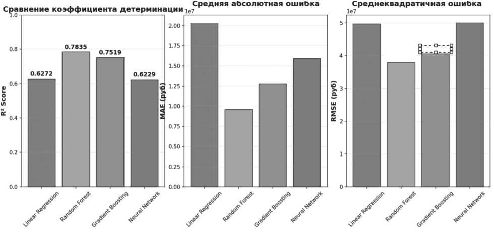 На Рисунке 7 представлены коэффициенты детерминации, средние абсолютные ошибки и среднеквадратичные ошибки в результате обучения моделей.