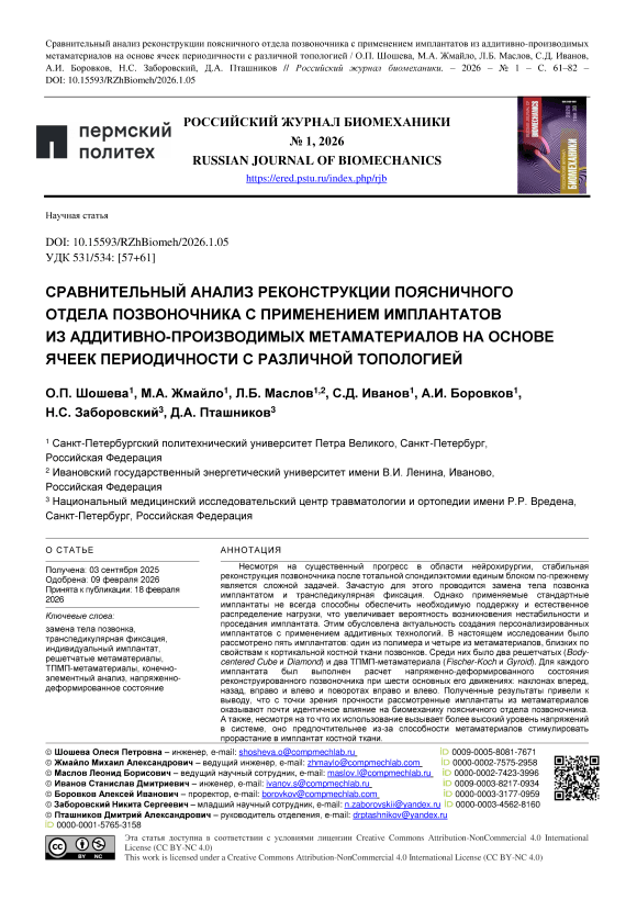 Несмотря на существенный прогресс в области нейрохирургии, стабильная реконструкция позвоночника после тотальной спондилэктомии единым блоком по-прежнему является сложной задачей. Зачастую для этого проводится замена тела позвонка имплантатом и транспедикулярная фиксация. Однако применяемые стандартные имплантаты не всегда способны обеспечить необходимую поддержку и естественное распределение нагрузки, что увеличивает вероятность возникновения нестабильности и проседания имплантата. Этим обусловлена актуальность создания персонализированных имплантатов с применением аддитивных технологий. В настоящем исследовании было рассмотрено пять имплантатов: один из полимера и четыре из метаматериалов, близких по свойствам к кортикальной костной ткани позвонков. Среди них было два решетчатых (Body-centered Cube и Diamond) и два ТПМП-метаматериала (Fischer-Koch и Gyroid). Для каждого имплантата был выполнен расчет напряженно-деформированного состояния реконструированного позвоночника при шести основных его движениях: наклонах вперед, назад, вправо и влево и поворотах вправо и влево. Полученные результаты привели к выводу, что с точки зрения прочности рассмотренные имплантаты из метаматериалов оказывают почти идентичное влияние на биомеханику поясничного отдела позвоночника. А также, несмотря на то что их использование вызывает более высокий уровень напряжений в системе, оно предпочтительнее из-за способности метаматериалов стимулировать прорастание в имплантат костной ткани.
