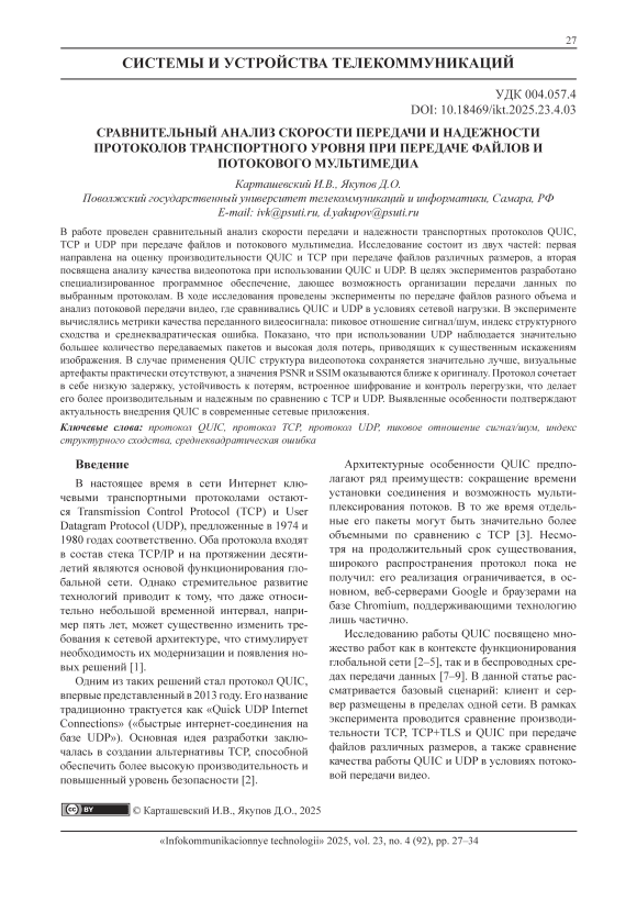 В работе проведен сравнительный анализ скорости передачи и надежности транспортных протоколов QUIC, TCP и UDP при передаче файлов и потокового мультимедиа. Исследование состоит из двух частей: первая направлена на оценку производительности QUIC и TCP при передаче файлов различных размеров, а вторая посвящена анализу качества видеопотока при использовании QUIC и UDP. В целях экспериментов разработано специализированное программное обеспечение, дающее возможность организации передачи данных по выбранным протоколам. В ходе исследования проведены эксперименты по передаче файлов разного объема и анализ потоковой передачи видео, где сравнивались QUIC и UDP в условиях сетевой нагрузки. В эксперименте вычислялись метрики качества переданного видеосигнала: пиковое отношение сигнал/шум, индекс структурного сходства и среднеквадратическая ошибка. Показано, что при использовании UDP наблюдается значительно большее количество передаваемых пакетов и высокая доля потерь, приводящих к существенным искажениям изображения. В случае применения QUIC структура видеопотока сохраняется значительно лучше, визуальные артефакты практически отсутствуют, а значения PSNR и SSIM оказываются ближе к оригиналу. Протокол сочетает в себе низкую задержку, устойчивость к потерям, встроенное шифрование и контроль перегрузки, что делает его более производительным и надежным по сравнению с TCP и UDP. Выявленные особенности подтверждают актуальность внедрения QUIC в современные сетевые приложения.