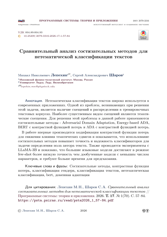 Состязательные методы, контрастная функция потерь, классификация гендера, классификация текстов, нетематическая классификация, bert, доменная адаптация
