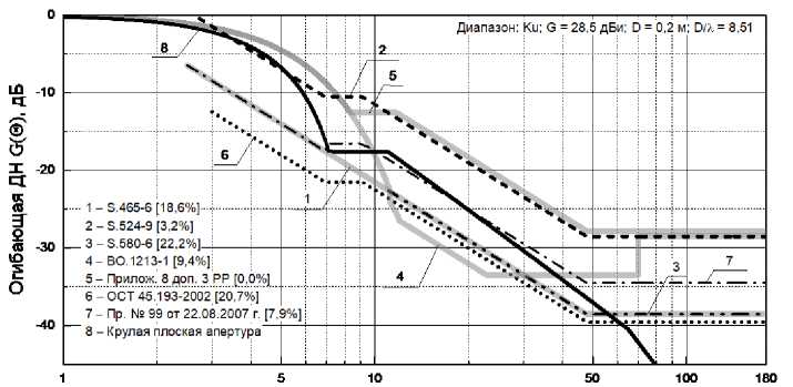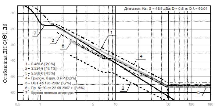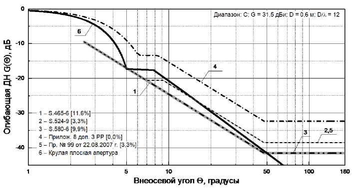 Для «С»-диапазона (рис. 1, 5, таблица 2) огибающая ДН круглой плоской апертуры с коэффициентом усиления (КУ), равным 31,5 дБи, и диаметром 0,6 м имеет незначительные превышения регламентирующих огибающих ДН (менее 10 %), за исключением огибающей рекомендации МСЭ-R S.465-6, где превышение составляет 11,6 %. Также, в «С»-диапазоне огибающие ДН, определяемые Рекомендацией МСЭ-R S.524-9 и приказом Министерства информационных технологий и связи Российской Федерации от 22.08.2007 г. № 99, одинаковы, а огибающие ДН, определяемые рекомендациями S.465-6, и S.580-6 совпадают в секторе углов от 7,6° до 180°. Рекомендацией МСЭ-R BO.1213-1 и стандартом отрасли РФ ОСТ 45.193-2002 в «С»-диапазоне огибающие ДН не определяются.