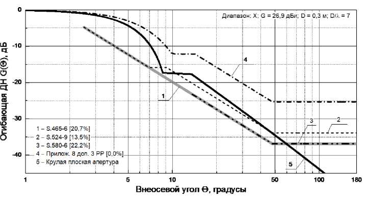 В «X» диапазоне (рис. 2, 5, таблица 2) огибающая ДН круглой плоской апертуры с КУ = 26,9 дБи и диаметром 0,3 м имеет существенные превышения регламентирующих огибающих ДН: для рекомендации S.524-9 – на 13,5 %; для S.465-6 – на 20,7 %; и для S.580-6 – максимальное превышение в 22,2 %. Огибающие ДН, определяемые рекомендациями МСЭ-R S.465-6 и S.580-6, совпадают в секторе углов от 13,7° до 180°. Также имеется совпадение огибающих ДН, определяемых рекомендациями МСЭ-R S.465-6 и S.524-9, в секторе углов от 2,5° до 7,0°. Рекомендацией МСЭ-R BO.1213-1, стандартом отрасли РФ ОСТ 45.193-2002 и приказом Министерства информационных технологий и связи Российской Федерации от 22.08.2007 № 99 в «X»-диапазоне огибающие ДН не определяются.