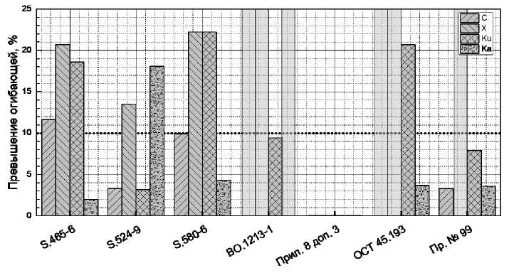 На рис. 5 столбцы, отображающие величину процентной доли превышения огибающей ДН, для различных участков диапазонов заполнены соответствующими видами штриховок, обозначенных в верхнем правом углу рисунка, а участки диапазонов, на которые нормативными документами не устанавливаются формы огибающей ДН, показаны столбцами без штриховки, при этом величина превышения для каждого нормативного документа представлена четырьмя столбцами по участкам диапазона «C», «X», «Ku» и «Ka», за исключением Дополнения 3 к Приложению 8 Регламента радиосвязи, где превышений не име- ется ни на одном из рассматриваемых участков диапазона.