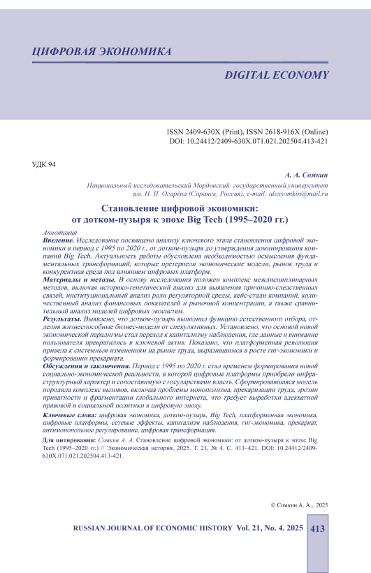 Введение. Исследование посвящено анализу ключевого этапа становления цифровой экономики в период с 1995 по 2020 г., от дотком-пузыря до утверждения доминирования компаний Big Tech. Актуальность работы обусловлена необходимостью осмысления фундаментальных трансформаций, которые претерпели экономические модели, рынок труда и конкурентная среда под влиянием цифровых платформ. Материалы и методы. В основу исследования положен комплекс междисциплинарных методов, включая историко-генетический анализ для выявления причинно-следственных связей, институциональный анализ роли регуляторной среды, кейс-стади компаний, количественный анализ финансовых показателей и рыночной концентрации, а также сравнительный анализ моделей цифровых экосистем. Результаты. Выявлено, что дотком-пузырь выполнил функцию естественного отбора, отделив жизнеспособные бизнес-модели от спекулятивных. Установлено, что основой новой экономической парадигмы стал переход к капитализму наблюдения, где данные и внимание пользователя превратились в ключевой актив. Показано, что платформенная революция привела к системным изменениям на рынке труда, выразившимся в росте гиг-экономики и формировании прекариата. Обсуждения и заключения. Период с 1995 по 2020 г. стал временем формирования новой социально-экономической реальности, в которой цифровые платформы приобрели инфраструктурный характер и сопоставимую с государствами власть. Сформировавшаяся модель породила комплекс вызовов, включая проблемы монополизма, прекаризации труда, эрозии приватности и фрагментации глобального интернета, что требует выработки адекватной правовой и социальной политики в цифровую эпоху.