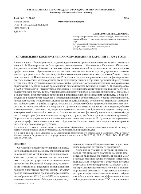 Рассматривается создание и деятельность промышленно-экономического техникума имени А. В. Луначарского как базы среднего кооперативного образования в Карелии в 1920-е годы. Актуальность темы объясняется поиском эффективных моделей модернизации системы среднего профессионального образования для достижения технологического лидерства, укрепления экономического суверенитета и обеспечения устойчивого социально-экономического развития России. На основе документов Национального архива Республики Карелия впервые описывается формирование системы подготовки кадров среднего звена для кооперативных и торговых организаций республики в годы нэпа. Цель публикации состоит в том, чтобы представить становление среднего кооперативного образования в Карелии на базе промышленно-экономического техникума имени А. В. Луначарского в 1920-е годы; задачи – рассмотреть образование и функционирование техникума; выяснить его преподавательский состав, формы учебной деятельности учащихся, основные дисциплины, связанные с подготовкой кооперативных работников в промышленно-экономическом техникуме. В ходе исследования обнаружены сведения о профессиональном и образовательном уровне преподавателей, численном составе учащихся и выпускников техникума. Показаны особенности выработки образовательной программы и учебных курсов, связанных с освоением общих предметов и специальных дисциплин, в том числе в области кооперации и торговли, куда входило изучение товароведения, общего и кооперативного счетоводства, видов кооперативных организаций, истории и теории кооперации, кооперативной и торговой статистики. Выявлены различные формы обучения и подготовки будущих кооператоров (лекции, семинары, экскурсии, кружки, учебная и производственная практика). Определен вклад промышленно-экономического техникума имени А. В. Луначарского в развитие среднего профессионально-технического образования Карелии, подготовку кадров для кооперативного сектора экономики республики.
