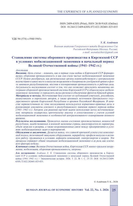 Введение. Цель статьи – показать, как в первые годы войны в Киргизской ССР формировалась оборонная промышленность и как она стала частью мобилизационной экономики СССР. Нужно разобраться, как региональные органы взаимодействовали с центральными ведомствами и какое место в выпуске вооружения и боеприпасов для Красной армии и флота занимали республиканская, местная и кооперативная промышленность и рабочая сила. Актуальность исследования состоит в том, что оно позволяет проследить механизмы интеграции оборонной производственной системы Киргизской ССР в общесоюзную мобилизационную экономику и определить вклад региона в обеспечение фронтов Красной армии. Материалы и методы. Источниковая база состоит из публикаций советских, российских, казахстанских и киргизских авторов, а также архивных источников Центрального государственного архива Кыргызской Республики и архивов Российской Федерации. В качестве первоисточников по теме исследования используются нормативно-правовые акты и руководящие документы союзного и республиканского значения первого периода войны (1941–1942 гг.). Автором для решения научной задачи использован метод источниковедения; материалы подверглись критическому анализу и сопоставлению с учетом условий мобилизационной экономики и особенностей централизованного планирования военного времени. Результаты исследования. Проводится оценка состояния производственных мощностей республики, задействованных в военной экономике страны, анализируются их параметры, объем загрузки и резервы, а также координационные связи между предприятиями в условиях мобилизационных задач и мероприятий. Обсуждение и заключение. Делается вывод, что главной причиной успеха стал комплексный подход, включавший эвакуацию оборудования, переработку профиля выпуска и активную работу трудящихся в условиях дефицита помещений, электроэнергии и кадров. Эти процессы отражают общие тенденции мобилизационной экономики и ее роль как ключевого фактора победы.