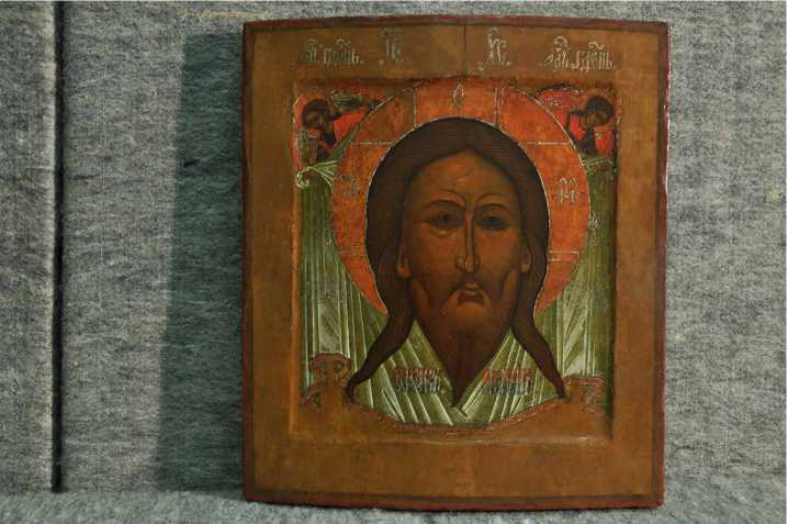 На другой, довольно убедительно выполненной иконе-стилизации XIX в., «Спас Нерукотворный» ( ил. 6 ) в красочном слое, помимо охр, белил, черной угольной, тоже были идентифицированы пигменты Нового времени — берлинская лазурь и желтый кадмий.