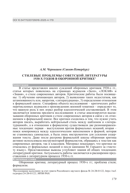 В статье представлен анализ суждений оборонных критиков 1930-х гг., статьи которых появлялись на страницах журналов «Залп», «ЛОКАФ» и «Знамя», о стиле современных авторов. Критические работы были посвящены: 1) обучению начинающих авторов, 2) выявлению таких недостатков, как штампованность или, напротив, «литературщина», 3) определению отношения к формальной школе. Специфика объекта исследования – критических работ перечисленных журналов о произведениях военной тематики – определяет то, что важную роль в них играл разбор идеологической составляющей. В этом заключается новизна предмета исследования: в статье анализируются высказывания оборонных критиков о стиле современных авторов в связи с их отношением к формальной школе. Все критики сходились в том, что нужно учить авторов писать, выработать нейтральный стиль между шаблоном и «литературщиной», а в отношении к формализму существовали две разнонаправленные тенденции: первая – выступления против формальных исканий, вторая – поиск компромисса между идеологическим наполнением и формой, которая не становилась самоцелью, а была лишь инструментом для усиления содержания текста. Даже после разгрома формальной школы оборонная критика активно использовала инструментарий формалистов, обращаясь к текстам как современных авторов, так и классиков. Материал показывает, что критики не отказались от формальных исканий и после кампании М. Горького за «чистоту языку». Представленные выводы углубляют знания об общих тенденциях литературной критики. Актуальность работы заключается в расширении представления о литературном процессе 1930-х гг.