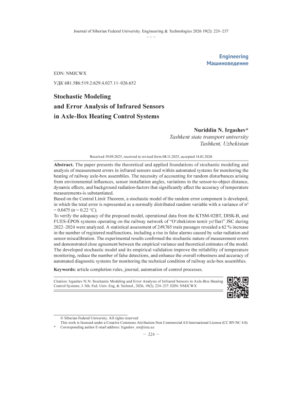 В статье представлены теоретические и прикладные основы стохастического моделирования и анализа погрешностей инфракрасных датчиков, применяемых в автоматизированных системах контроля нагрева буксовых узлов железнодорожного подвижного состава. Обоснована необходимость учёта случайных возмущений, возникающих под воздействием факторов внешней среды, углов установки датчиков, изменений расстояния до объекта, динамических воздействий и фонового излучения, существенно влияющих на достоверность температурных измерений. На основе центральной предельной теоремы разработана стохастическая модель случайной составляющей погрешности, в которой суммарная ошибка представлена как нормально распределённая случайная величина с дисперсией σ² = 0,0475 (σ ≈ 0,22 °C). Для проверки адекватности предложенной модели использованы эксплуатационные данные систем КТСМ‑02БТ (комплекс технических средств контроля за состоянием подвижного состава) и ДИСК-Б (дистанционно-информационная система контроля букс), функционирующих на участках АО “Ўзбекистон темир йўллари” в 2022–2024 гг. Проведён статистический анализ 249765 проходов поездов, показавший увеличение числа зарегистрированных неисправностей на 62 %, включая рост количества ложных срабатываний, обусловленных воздействием солнечного излучения и некорректной калибровкой датчиков. Полученные результаты подтвердили стохастический характер ошибок измерений и соответствие экспериментальной дисперсии теоретическим оценкам разработанной модели. Разработанная стохастическая модель и результаты её экспериментальной валидации позволяют повысить достоверность температурного контроля, снизить количество ложных сигналов и обеспечить более надёжную работу автоматизированных систем диагностики технического состояния буксовых узлов железнодорожного подвижного состава.