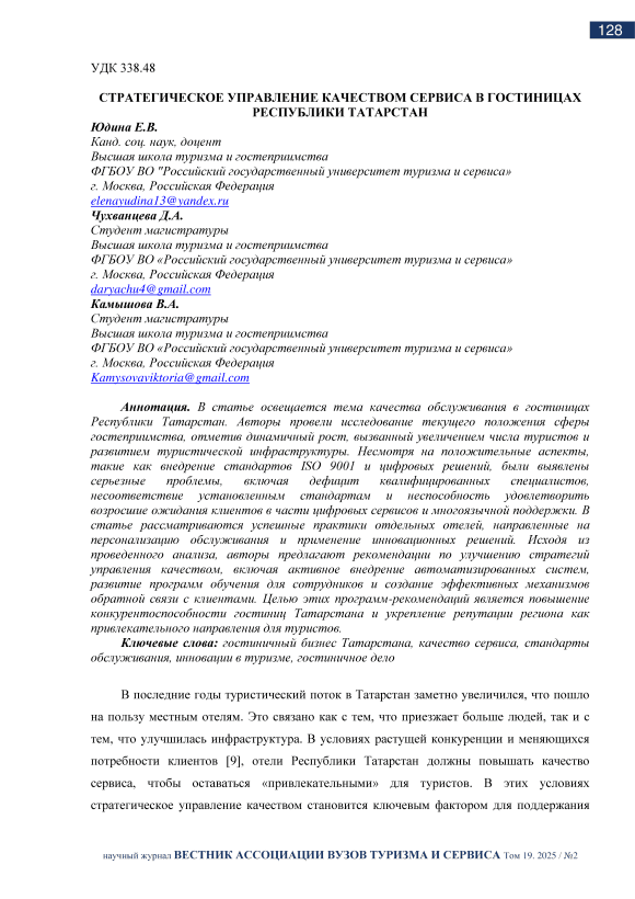 В статье освещается тема качества обслуживания в гостиницах Республики Татарстан. Авторы провели исследование текущего положения сферы гостеприимства, отметив динамичный рост, вызванный увеличением числа туристов и развитием туристической инфраструктуры. Несмотря на положительные аспекты, такие как внедрение стандартов ISO 9001 и цифровых решений, были выявлены серьезные проблемы, включая дефицит квалифицированных специалистов, несоответствие установленным стандартам и неспособность удовлетворить возросшие ожидания клиентов в части цифровых сервисов и многоязычной поддержки. В статье рассматриваются успешные практики отдельных отелей, направленные на персонализацию обслуживания и применение инновационных решений. Исходя из проведенного анализа, авторы предлагают рекомендации по улучшению стратегий управления качеством, включая активное внедрение автоматизированных систем, развитие программ обучения для сотрудников и создание эффективных механизмов обратной связи с клиентами. Целью этих программ-рекомендаций является повышение конкурентоспособности гостиниц Татарстана и укрепление репутации региона как привлекательного направления для туристов.