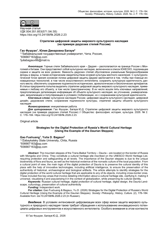 Горные степи Забайкальского края – Даурия – располагаются на границе России с Монголией и Китаем. Они представляют собой культурное наследие, включенное в список ЮНЕСКО, подлежащее охране и защите на всех уровнях. Важность даурских степей обусловлена уникальным биоразнообразием флоры и фауны, а также историческим свидетельством кочевой культуры местного населения. С культурологической точки зрения основная логика цифровой защиты Даурии заключается в том, чтобы при помощи инновационных технологий, в том числе искусственного интеллекта, сохранить культурную идентичность данного места, обеспечить сохранение подлинности исторических, археологических и биологических артефактов. В статье предпринята попытка выделить стратегии цифровой защиты мирового культурного наследия, применимые к любому его объекту, в том числе трансграничному. В их число вошли пять ключевых направлений, предполагающих детализацию информации об объекте культурного наследия, ее уточнение, универсализацию, визуализацию и популяризацию в условиях глобализации, но с сохранением культурной идентичности.