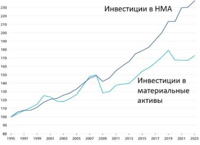Рис. 1. Совокупный объём инвестиций в НМА растёт быстрее инвестиций в материальные активы [3]