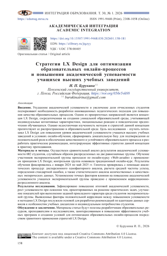 Введение. Ухудшение академической успеваемости и увеличение доли отчисленных студентов подчеркивают необходимость разработки инновационных педагогических подходов для повышения качества образовательных процессов. Одним из приоритетных направлений является концепция LX Design, сосредоточенная на создании уникальной образовательной среды, учитывающей индивидуальные когнитивные характеристики, эмоциональные реакции и поведенческие предпочтения обучающихся. Однако недостаточная изученность методов и стратегий данной концепции препятствуют ее распространению в образовательной среде. Цель исследования – изучить потенциал LX Design для повышения уровня академической успеваемости учащихся высших учебных заведений в условиях онлайн-обучения, сформировать доказательную базу для подтверждения ее положительной роли в обеспечении качественного и устойчивого образовательного процесса и разработать практические рекомендации, интегрирующие эффективные стратегии данной концепции в практику преподавания. Материалы и методы. Осуществлен сравнительный анализ результатов академической успеваемости 682 студентов, случайным образом распределенных на две равнозначные группы. Обучение участников экспериментальной группы проходило по онлайн-курсу «Web-дизайн» с применением принципов LX Design; контрольная группа осваивала традиционный онлайн-курс. Результаты обучения фиксировались с января 2024 по май 2025 гг. Гипотеза проверялась с помощью аналитических процедур: дисперсионного однофакторного анализа, расчета средней частоты успеха, определения стандартной ошибки, а также статистического анализа количественных и качественных эмпирических данных. Установление точных факторов влияния на повышение академической успеваемости учащихся экспериментальной группы проведено с применением корреляционно-регрессионного анализа. Результаты исследования. Зафиксировано повышение итоговой академической успеваемости, рост успеваемости при освоении тем, ориентированных на решение практических задач, улучшение показателей при выполнении заданий прикладного характера среди студентов экспериментальной группы. Выявленные факторы положительной корреляции между повышением успеваемости и методами LX Design послужили основой для разработки рекомендаций по адаптации данных сервисов к особенностям учебных дисциплин и индивидуальным потребностям студентов. Обсуждение и заключение. Материалы статьи будут полезны разработчикам образовательных ресурсов, преподавателям и исследователям, заинтересованным в повышении эффективности учебных программ и создании условий для оптимизации образовательных онлайн-процессов посредством грамотного применения стратегий LX Design.