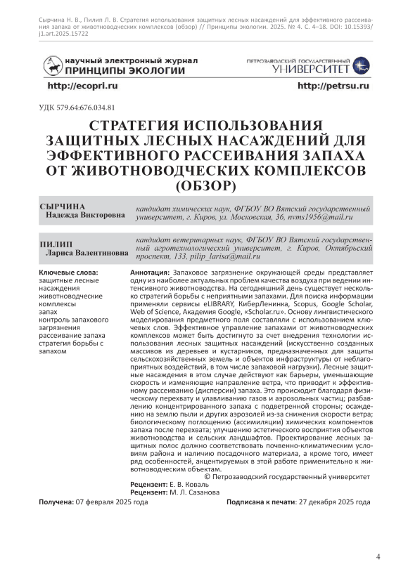Запаховое загрязнение окружающей среды представляет одну из наиболее актуальных проблем качества воздуха при ведении интенсивного животноводства. На сегодняшний день существует несколько стратегий борьбы с неприятными запахами. Для поиска информации применяли сервисы eLIBRARY, КиберЛенинка, Scopus, Google Scholar, Web of Science, Академия Google, «Scholar.ru». Основу лингвистического моделирования предметного поля составляли с использованием ключевых слов. Эффективное управление запахами от животноводческих комплексов может быть достигнуто за счет внедрения технологии использования лесных защитных насаждений (искусственно созданных массивов из деревьев и кустарников, предназначенных для защиты сельскохозяйственных земель и объектов инфраструктуры от неблагоприятных воздействий, в том числе запаховой нагрузки). Лесные защитные насаждения в этом случае действуют как барьеры, уменьшающие скорость и изменяющие направление ветра, что приводит к эффективному рассеиванию (дисперсии) запаха. Это происходит благодаря физическому перехвату и улавливанию газов и аэрозольных частиц; разбавлению концентрированного запаха с подветренной стороны; осаждению на землю пыли и других аэрозолей из-за снижения скорости ветра; биологическому поглощению (ассимиляции) химических компонентов запаха после перехвата; улучшению эстетического восприятия объектов животноводства и сельских ландшафтов. Проектирование лесных защитных полос должно соответствовать почвенно-климатическим условиям района и наличию посадочного материала, а кроме того, имеет ряд особенностей, акцентируемых в этой работе применительно к животноводческим объектам.