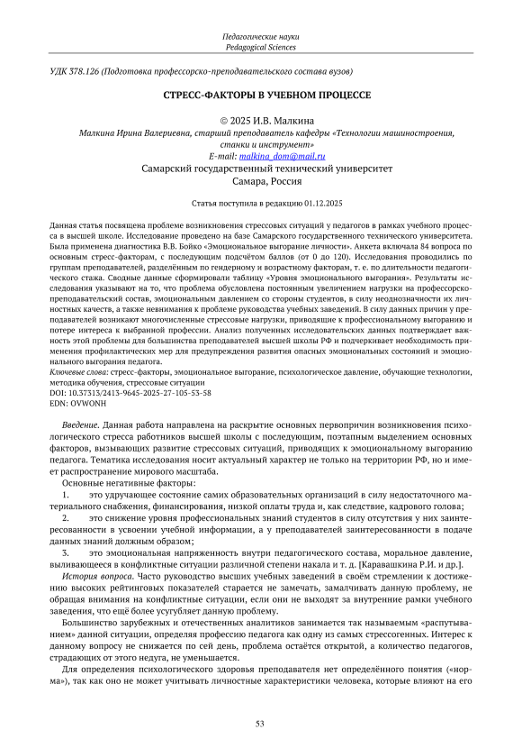 Данная статья посвящена проблеме возникновения стрессовых ситуаций у педагогов в рамках учебного процесса в высшей школе. Исследование проведено на базе Самарского государственного технического университета. Была применена диагностика В.В. Бойко «Эмоциональное выгорание личности». Анкета включала 84 вопроса по основным стрессфакторам, с последующим подсчётом баллов (от 0 до 120). Исследования проводились по группам преподавателей, разделённым по гендерному и возрастному факторам, т. е. по длительности педагогического стажа. Сводные данные сформировали таблицу «Уровня эмоционального выгорания». Результаты исследования указывают на то, что проблема обусловлена постоянным увеличением нагрузки на профессорскопреподавательский состав, эмоциональным давлением со стороны студентов, в силу неоднозначности их личностных качеств, а также невнимания к проблеме руководства учебных заведений. В силу данных причин у преподавателей возникают многочисленные стрессовые нагрузки, приводящие к профессиональному выгоранию и потере интереса к выбранной профессии. Анализ полученных исследовательских данных подтверждает важность этой проблемы для большинства преподавателей высшей школы РФ и подчеркивает необходимость применения профилактических мер для предупреждения развития опасных эмоциональных состояний и эмоционального выгорания педагога.