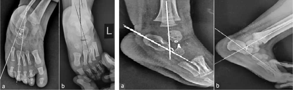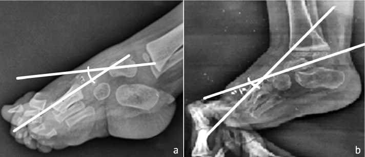 Talocalcaneal Angle measures hindfoot alignment since decreased angles indicate residual varus. This angle was measured by obtaining an anteroposterior (AP) radiograph of the foot. Identify the central axis of the talus (line drawn along the talar body and neck) and the central axis of the calcaneus. Measure the angle formed by the intersection of these two lines. The normal value range between 25º and 40º. Below this value indicates residual varus deformity (Fig. 1).