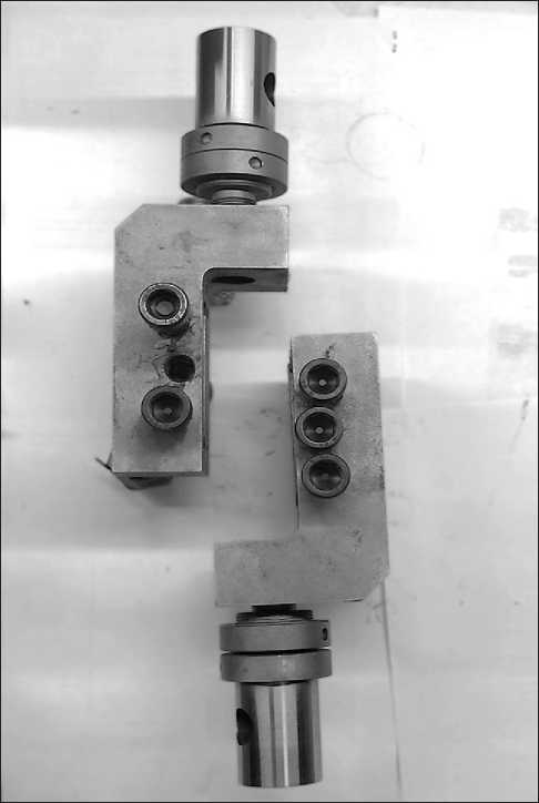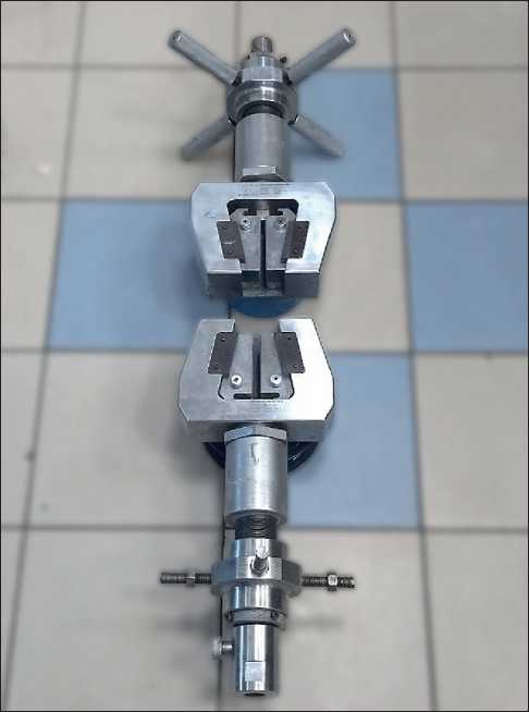 The test method consists in stretching a sample with V-shaped incisions fixed in two grips in such a way that the working area of the sample between the tops of the incisions is parallel to the loading axis, which ensures the creation of shear deformations in the sample. Each half of the device consists of a gripper and two gas-insulated jaws. Three bolts create a clamping force on each sponge to fix the sample under load (Fig. 7).