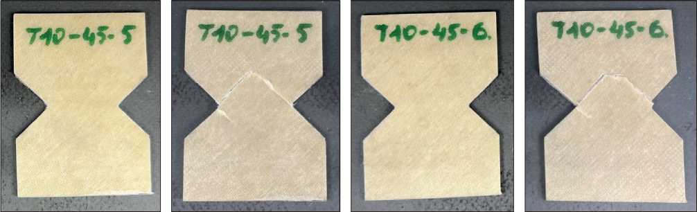 Fig. 8. Photo of samples from FRP based on fiberglass T-10 and binder VK-51, reinforcement direction 45° before and after shear tests in the plane