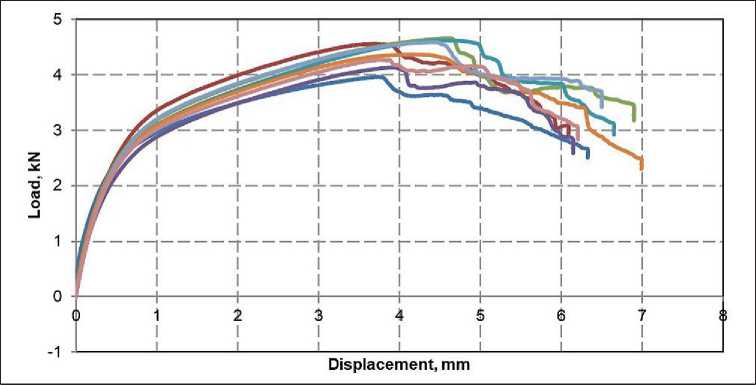 It follows from the graph (Fig. 9) that at the first stages of testing, all samples show a linear increase in load with increasing displacement. When the graph moves to the plastic region, each sample reaches its maximum load value. Then a plateau is observed – the samples withstand a given load, but show differences in strength and resistance to constant shear. Subsequently, the graph lines tend sharply downward, indicating the limiting state of the material.