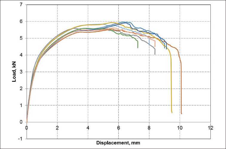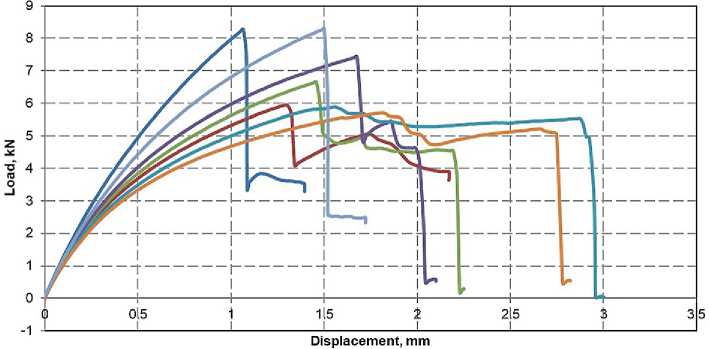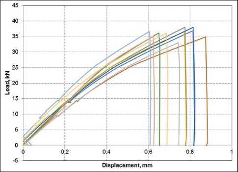 In the initial section of the graph (Fig. 13), a linear relationship is noted, indicating the ability of the material to withstand loads without significant deformations. The samples reach peak load values, after which the load growth slows down with increasing displacement and the process of inelastic deformations begins. Subsequently, there is a sharp drop in load with increasing displacement, which indicates a loss of strength.