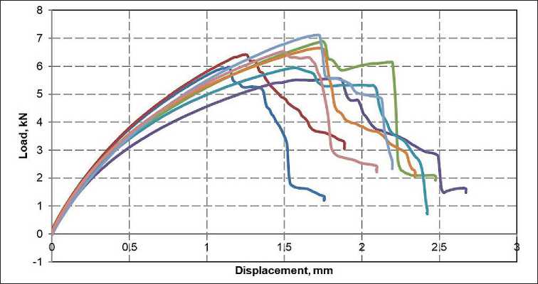 At the beginning of the tests under low loads, the samples exhibit linear elastic deformation. Then most of the samples reach their maximum load, after which a sharp decrease begins, indicating destruction (Fig. 10).