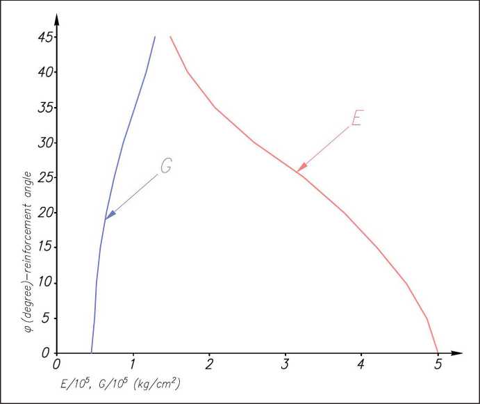 Figure 1 shows a graph illustrating changes in the tensile modulus E and the shear modulus G depending on the reinforcement angle for unidirectional fiberglass SK-5-211, which consists of T-25 fiber-glass cloth and 5-211B epoxy binder.