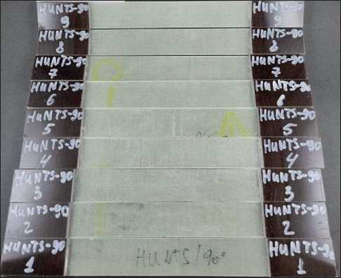 Fig. 3. Photo illustration of FRP samples based on T-10 fiberglass and Huntsman binder, reinforcement direction 90° before and after tensile tests