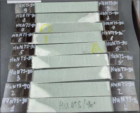 The object of the study is samples for each “fillermatrix” combination, obtained by cutting from flat monolithic panels manufactured by vacuum forming (cold laying). In total, more than 400 dry samples (RTD) were tested under normal climatic conditions (23±5)°C in accordance with GOST 12423-2013.