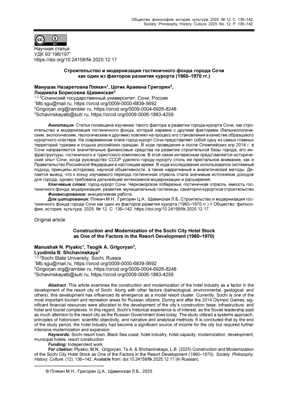 Статья посвящена изучению такого фактора в развитии города-курорта Сочи, как строительство и модернизация гостиничного фонда, который наравне с другими факторами (бальнеологическим, экологическим, геологическим и другими) повлиял на процесс его становления в качестве образцового курортного кластера. На современном этапе город-курорт Сочи представляет собой одну из самых главных территорий туризма и отдыха российских граждан. В ходе проведения и после Олимпийских игр 2014 г. в Сочи направляются значительные финансовые средства на развитие строительной базы города, его инфраструктуры, гостиничного и туристского комплексов. В этой связи интересным представляется исторический опыт Сочи, когда руководство СССР уделяло городу-курорту столь же пристальное внимание, как и Правительство Российской Федерации в настоящее время. В ходе исследования использовался системный подход, принципы историзма, научной объективности, а также нарративный и аналитический методы. Делается вывод, что к концу изучаемого периода гостиничная отрасль стала значимым источником доходов для города, однако требовала дальнейшей интенсивной модернизации и расширения.