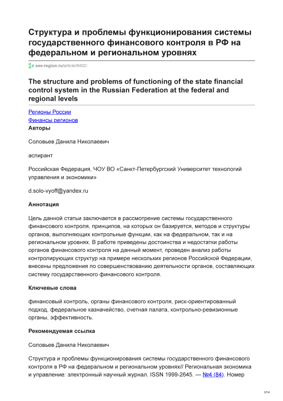 Структура и проблемы функционирования системы государственного финансового контроля в РФ на федеральном и региональном уровнях// Региональная экономика и управление: электронный научный журнал. ISSN 1999-2645. — №4 (84). Номер статьи: 8402. Дата публикации: 28.11.2025. Режим доступа: https://eee-