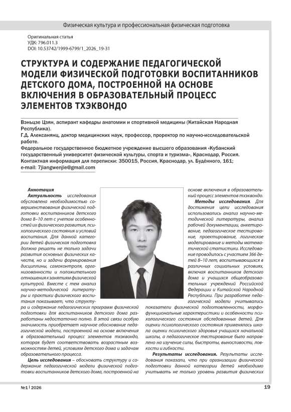 Актуальность исследования обусловлена необходимостью совершенствования физической подготовки воспитанников детского дома 8–10 лет с учетом особенностей их физического развития, психологического состояния и условий воспитания. Для данной категории детей физическая подготовка должна решать не только задачи развития основных физических качеств, но и задачи формирования дисциплины, самоконтроля, организованности и положительного отношения к занятиям физической культурой. Вместе с тем анализ научно-методической литературы и практики физического воспитания показывает, что структура и содержание педагогических программ физической подготовки для воспитанников детского дома разработаны недостаточно полно. В этой связи особую значимость приобретает научное обоснование педагогической модели, построенной на основе включения в образовательный процесс элементов тхэквондо, которая будет соответствовать возрастным возможностям детей, условиям детского дома и задачам образовательного процесса. Цель исследования – обосновать структуру и содержание педагогической модели физической подготовки воспитанников детского дома, построенной на основе включения в образовательный процесс элементов тхэквондо. Методы исследования. Для достижения цели исследования использовались анализ научно-методической литературы, анализ рабочей документации, анкетирование, педагогическое тестирование, проектирование, логическое моделирование и методы математической статистики. Исследование проводилось с участием 366 детей 8–10 лет, воспитывающихся в различных социальных условиях, включая воспитанников детского дома и учащихся общеобразовательных учреждений Российской Федерации и Китайской Народной Республики. При разработке педагогической модели учитывались показатели физической подготовленности, морфофункциональные характеристики и особенности психологического состояния обследованных детей. Для оценки психологического состояния применялась шкала оценки психического здоровья учащихся начальной школы, а педагогическое тестирование было направлено на изучение силы, быстроты, выносливости, ловкости и гибкости. Результаты исследования. Результаты исследования показали, что при организации физической подготовки данной категории детей необходимо учитывать не только уровень развития физических качеств, но и особенности социальной адаптации, поведения и психологического состояния. На этой основе разработана педагогическая модель физической подготовки воспитанников детского дома, построенная на основе включения в образовательный процесс элементов тхэквондо, включающая проективный, профессионально-компетентностный, организационно-содержательный, методико-технологический и контрольный компоненты. Содержание модели предусматривает поэтапное включение элементов тхэквондо, сочетание средств общей физической подготовки с воспитательными задачами, а также организацию педагогического контроля, направленного на оценку двигательных результатов, дисциплины, самоконтроля и отношения детей к занятиям физической культурой. Заключение. Педагогическая модель физической подготовки воспитанников детского дома, построенная на основе включения в образовательный процесс элементов тхэквондо, представляет собой целос