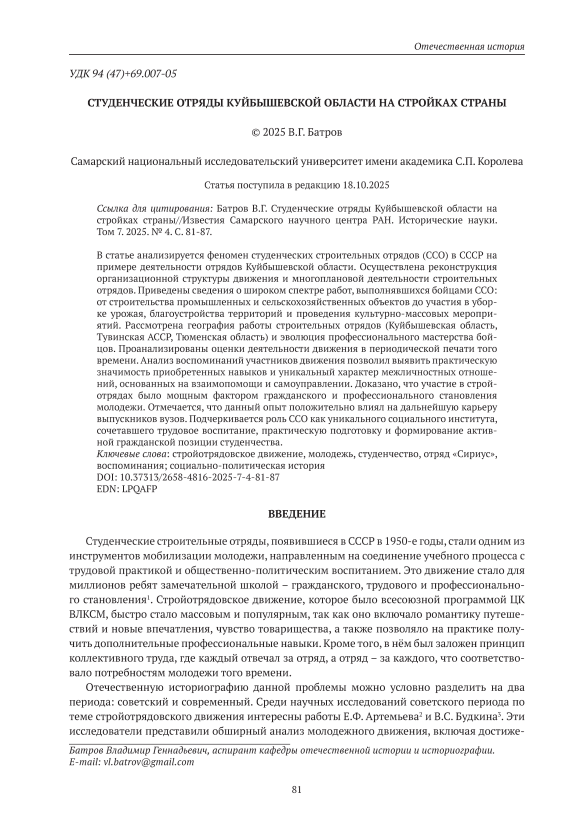 В статье анализируется феномен студенческих строительных отрядов (ССО) в СССР на примере деятельности отрядов Куйбышевской области. Осуществлена реконструкция организационной структуры движения и многоплановой деятельности строительных отрядов. Приведены сведения о широком спектре работ, выполнявшихся бойцами ССО: от строительства промышленных и сельскохозяйственных объектов до участия в уборке урожая, благоустройства территорий и проведения культурно-массовых мероприятий. Рассмотрена география работы строительных отрядов (Куйбышевская область, Тувинская АССР, Тюменская область) и эволюция профессионального мастерства бойцов. Проанализированы оценки деятельности движения в периодической печати того времени. Анализ воспоминаний участников движения позволил выявить практическую значимость приобретенных навыков и уникальный характер межличностных отношений, основанных на взаимопомощи и самоуправлении. Доказано, что участие в стройотрядах было мощным фактором гражданского и профессионального становления молодежи. Отмечается, что данный опыт положительно влиял на дальнейшую карьеру выпускников вузов. Подчеркивается роль ССО как уникального социального института, сочетавшего трудовое воспитание, практическую подготовку и формирование активной гражданской позиции студенчества.