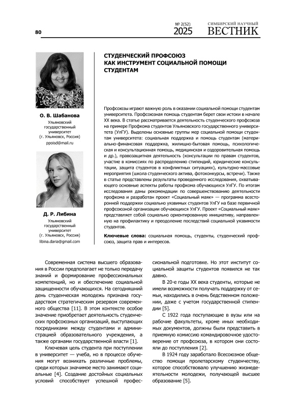 Trade unions play an important role in providing social assistance to university students. Trade union assistance to students dates back to the early 20th century. The article examines the activities of the student union using the example of the Ulyanovsk State University Students' Trade Union. The authors highlight the main groups of measures of social assistance to university: social support and assistance to students (material and financial support, housing and household assistance, psychological and advisory assistance, medical and health assistance, etc.), human rights activities (consultations on students' rights, participation in scholarship distribution commissions, legal consultations, protection of students in conflict situations), cultural events (student activist school, photo contests, meetings). The article also presents the results of the study, covering the main aspects of the work of the Ulyanovsk State University Students' Trade Union. Based on the results of the study, recommendations were given for improving the activities of the trade union committee and the project "Social Beacon" was developed — a program of comprehensive support for socially vulnerable students of Ulyanovsk State University based on the Primary Trade Union Organization of Ulyanovsk State University students. The project "Social Beacon" is a socially oriented initiative aimed at preventing and overcoming the consequences of social vulnerability among students.