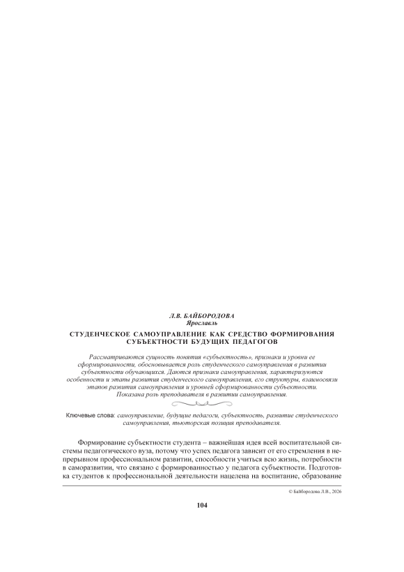 Самоуправление, будущие педагоги, субъектность, развитие студенческого самоуправления, тьюторская позиция преподавателя
