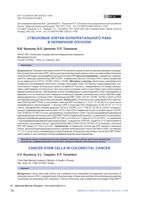 Актуальность. Раковые стволовые клетки (РСК) являются одной из причин прогрессирования и рецидивов колоректального рака (КРР). Детальное изучение фенотипа данных клеток, их иммунобиологических свойств необходимо для разработки методов лечения КРР. Цель исследования – определить содержание РСК, имеющих фенотип EpCAMhighCD44+, в первичной опухоли у больных КРР, а также экспрессию на их поверхности CD133, CD166, CD24 и CD184. Материал и методы. Выполнено одномоментное поперечное исследование клеточного состава опухолевой ткани 123 больных аденокарциномой толстой кишки III cтадии. Контрольную группу составили 87 больных, оперированных по поводу неопухолевых заболеваний толстой кишки. Для получения суспензии клеток опухолевой ткани использовали ферментативный метод. Гейтирование клеток нелимфоидного происхождения (CD45- ) производили в зависимости от экспрессии на их поверхности молекулы адгезии эпителиальных клеток EpCAM и дифференцировочного антигена CD44. Экспрессия EpCAM, CD44, СD133, CD166, СD184 и CD24 на РСК исследована методом проточной цитометрии. Результаты. Относительное содержание РСК с фенотипом CD45- EpCAMhighCD44+ в опухолевой ткани при КРР составило 17,15 [11,76; 26,44] % от пула клеток нелимфоидного происхождения. У больных КРР в структуре РСК обнаружено 42,83 [37,07; 51,77] % клеток, одновременно экспрессирующих СD133 и CD166, и 57,17 [48,23; 62,93] % клеток, экспрессирующих дифференцировочный антиген CD133. Все РСК в первичной опухоли экспрессируют CD184, и 95,18 [88,48; 97,98] % из них одновременно экспрессируют CD24. При высокодифференцированной аденокарциноме количество клеток EpCAMhighCD44+ в первичной опухоли в 1,5 раза ниже по отношению к умеренно дифференцированному КРР (U=326,5, p=0,002) и в 2,1 раза (U=21,0, p<0,001) – по сравнению с низкодифференцированной аденокарциномой. У пациентов c КРР IIIС стадии на 13 % увеличивается количество опухолевых клеток с фенотипом EpCAMhighCD44+CD133+CD166+ по отношению к больным КРР IIIВ стадии (U=1116,0, p=0,007). Заключение. В первичной опухоли при КРР раковые стволовые клетки, высокоэкспрессирующие молекулу адгезии эпителиальных клеток EpCAM и CD44, составляют 17,2 % от пула клеток нелимфоидного происхождения. Количество опухолевых клеток EpCAMhighCD44+ увеличивается при снижении степени дифференцировки аденокарциномы.