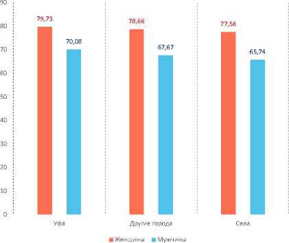 Средняя ожидаемая продолжительность жизни в Республике Башкортостан составляет 67,83 года у мужчин и 78,65 года у женщин (гендерный разрыв – 10,82 года). Разрыв распределен неравномерно: минимален в Уфе (9,65 года), максимален в сельской местности (11,82 года), что указывает на усиление гендерной диспропорции от урбанизированных к периферийным территориям.