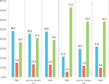 В отношении экологической обстановки заметна противоположная территориальная логика. Максимальная озабоченность экологической обстановкой наблюдается в промышленных городах республики (исключая столицу), где 28,1% мужчин и 34,2% женщин видят в экологии серьезную проблему, что отражает реальное промышленное загрязнение воздуха и воды, создаваемое индустриализацией. В Уфе озабоченность экологией существенно выше, чем в сельской местности: 17,8% мужчин и 15,0% женщин, что может указывать как на иные источники загрязнения (автотранспорт, стройки), так и на различия в экологической грамотности и информированности городского населения. В сельской местности озабоченность экологией минимальна (7,1% мужчин и 8,0% женщин), что может свидетельствовать либо об объективно лучшей экологической ситуации, либо об ограниченном осознании экологических рисков в условиях острейших проблем занятости и дохода, которые превалируют в иерархии забот сельского населения.