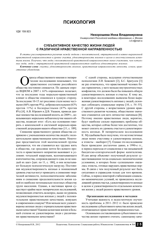 Фрагмент статьи Субъективное качество жизни людей с различной нравственной направленностью