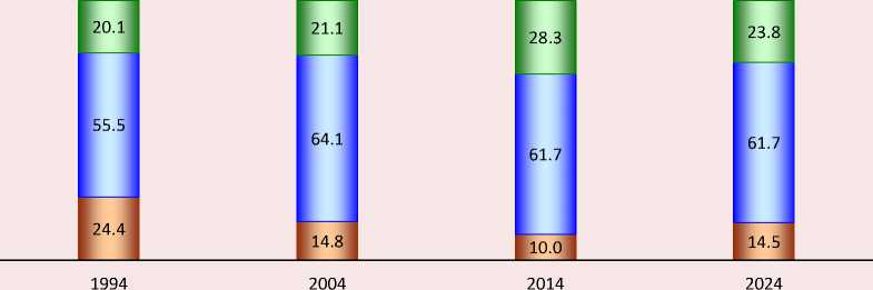 So, considering the dynamics of the transformation of the subjective stratification of Russian society in 1994–2024, attention is drawn primarily to the change in the number of groups with low status scores, which almost halved in the period from 1994 to 2004 ( Fig. 1 ). This happened against the background of intense transformations in the Russian social structure and the still open channels for social mobility. In the following decade (2004–2014), as positive economic developments continued, the group’s share continued to decline. However, from 2014 to 2024, there was a slight rollback and its number increased, although it does not exceed the level of 2004. In part, this may indicate a reaction to the stabilization of the social structure model that has developed as a result of the transformation period (Tikhonova, 2021a; Tikhonova, 2021b).