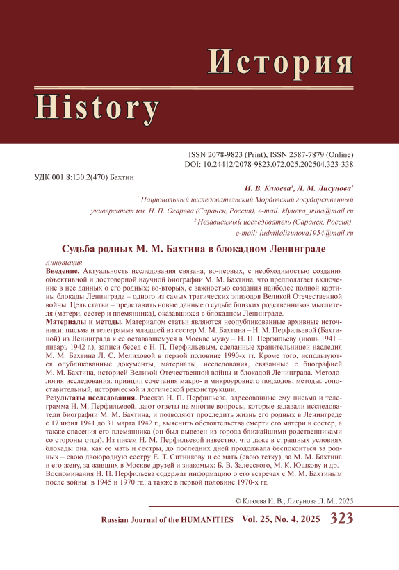 Введение. Актуальность исследования связана, во-первых, с необходимостью создания объективной и достоверной научной биографии М. М. Бахтина, что предполагает включение в нее данных о его родных; во-вторых, с важностью создания наиболее полной картины блокады Ленинграда – одного из самых трагических эпизодов Великой Отечественной войны. Цель статьи – представить новые данные о судьбе близких родственников мыслителя (матери, сестер и племянника), оказавшихся в блокадном Ленинграде. Материалы и методы. Материалом статьи являются неопубликованные архивные источники: письма и телеграмма младшей из сестер М. М. Бахтина – Н. М. Перфильевой (Бахтиной) из Ленинграда к ее остававшемуся в Москве мужу – Н. П. Перфильеву (июнь 1941 – январь 1942 г.), записи бесед с Н. П. Перфильевым, сделанные хранительницей наследия М. М. Бахтина Л. С. Мелиховой в первой половине 1990-х гг. Кроме того, используются опубликованные документы, материалы, исследования, связанные с биографией М. М. Бахтина, историей Великой Отечественной войны и блокадой Ленинграда. Методология исследования: принцип сочетания макро- и микроуровнего подходов; методы: сопоставительный, исторической и логической реконструкции. Результаты исследования. Рассказ Н. П. Перфильева, адресованные ему письма и телеграмма Н. М. Перфильевой, дают ответы на многие вопросы, которые задавали исследователи биографии М. М. Бахтина, и позволяют проследить жизнь его родных в Ленинграде с 17 июня 1941 до 31 марта 1942 г., выяснить обстоятельства смерти его матери и сестер, а также спасения его племянника (он был вывезен из города ближайшими родственниками со стороны отца). Из писем Н. М. Перфильевой известно, что даже в страшных условиях блокады она, как ее мать и сестры, до последних дней продолжала беспокоиться за родных – свою двоюродную сестру Е. Т. Ситникову и ее мать (свою тетку), за М. М. Бахтина и его жену, за живших в Москве друзей и знакомых: Б. В. Залесского, М. К. Юшкову и др. Воспоминания Н. П. Перфильева содержат информацию о его встречах с М. М. Бахтиным после войны: в 1945 и 1970 гг., а также в первой половине 1970-х гг. Обсуждение и заключение. Введенные в научный оборот ранее неизвестные архивные материалы существенно пополняют источниковую базу бахтиноведения, восполняют лакуны в биографии М. М. Бахтина и его родных, а также вносят свою лепту в коллективную летопись блокады Ленинграда, создавая предпосылки для дальнейших исследований и обобщений.