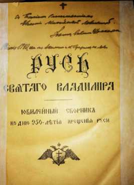 в Саратове протоиерей Лазарь Новокрещенных, хорошо помнивший свое харбинское детство и владыку Ювеналия еще архимандритом, высоко оценил это издание, оставив об этом свой искренний отзыв: «Прежде всего, хочу Вам выразить свою искреннюю благодарность за изданную Вами прекрасную книгу об архиепископе Ювеналии, прочел ее буквально за несколько дней, конечно, окунулся в далекое и такое близкое моему сердцу время детства и юности…»7 Помимо высокой оценки, о. Лазарь поделился своими воспоминаниями и присовокупил к ним этот редкий уникальный экземпляр сборника «Русь Святого Владимира».