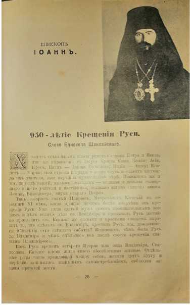Сборник состоит из нескольких частей, среди которых наиболее интересной представляется первая — официальная. Она включает несколько вступительных статей, так называемых «Владимирских посланий», объединенных единой юбилейной темой 950-летия Крещения Руси. Первым стало послание митрополита Анастасия (Грибанов-ского)9, председателя Русского Архиерейского Синода заграницей. За ним следует обращение главы Русской Духовной Миссии в Китае архиепископа Виктора (Святина)10.